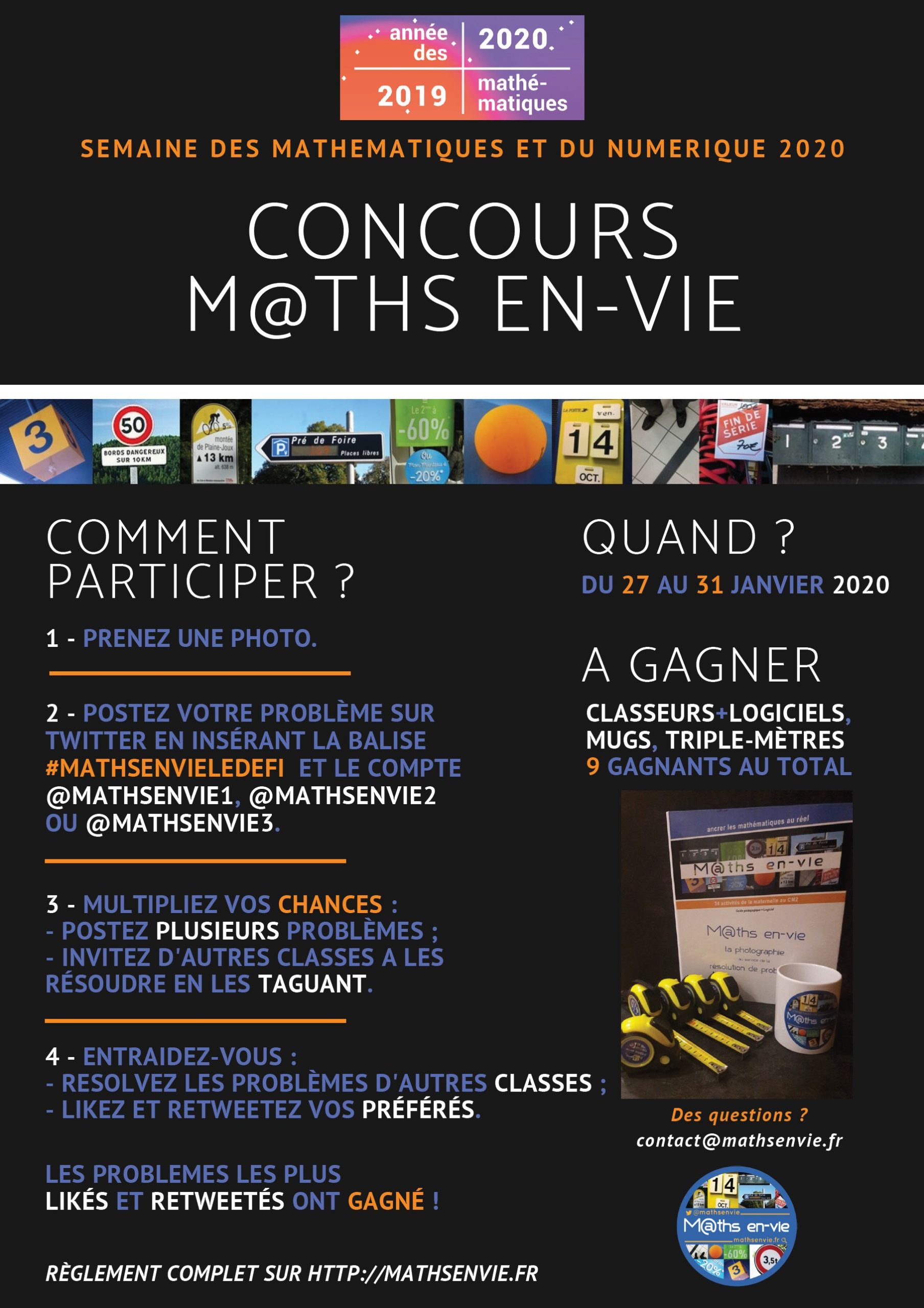 Ce concours a pour objectifs de proposer une activité motivante en résolution de problèmes et de faire découvrir le dispositif M@ths en-vie, son esprit et le réseau social élève autour de la résolution de problèmes. L’activité pourra d’ailleurs être poursuivie bien au-delà de cette semaine. Pour en savoir plus : cliquer ici