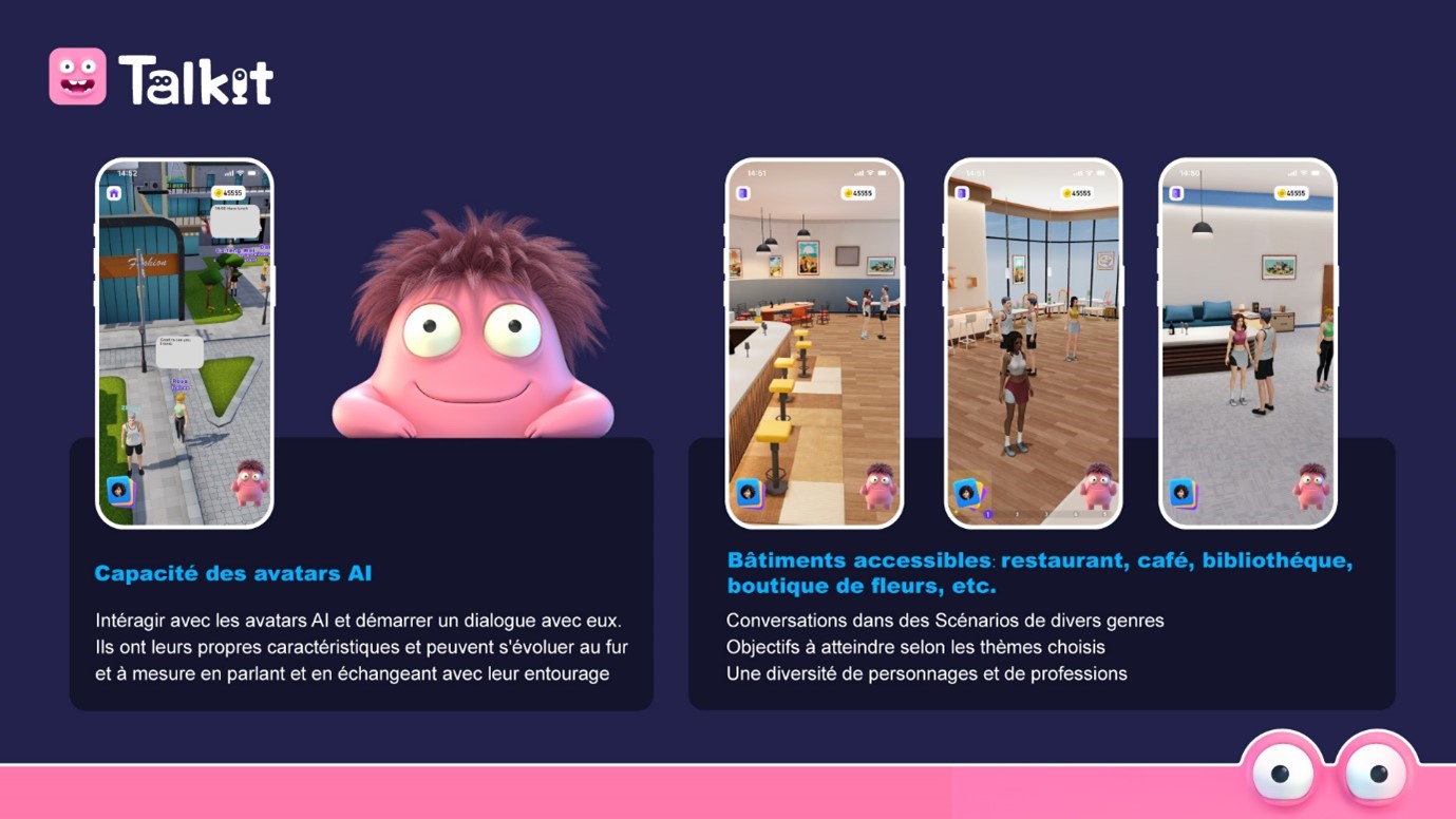 Disponible en exclusivité en France, TalkIt repose sur une technologie d’IA, grâce à laquelle l’utilisateur est plongé dans un monde immersif pour apprendre et pratiquer oralement la langue anglaise de manière interactive et engageante.