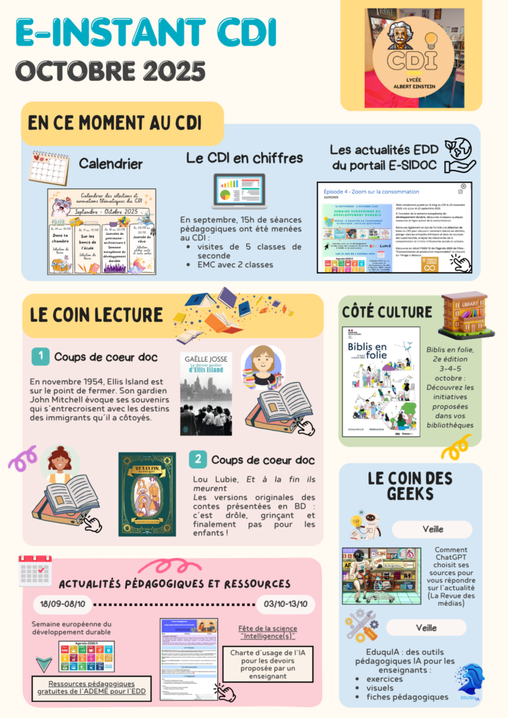 Il garde à peu près la même structure : une rubrique “En ce moment au CDI”, un coin lecture, une veille culturelle, pédagogique et numérique. Voici le numéro proposé pour octobre :