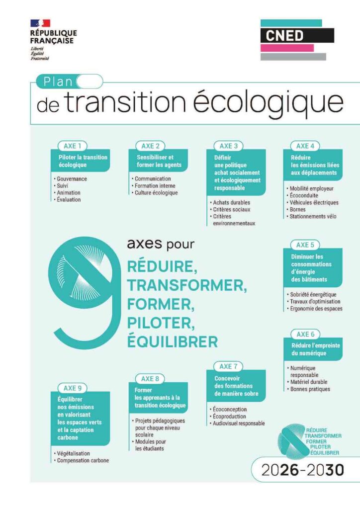 Dans ce cadre, le Cned publie aujourd’hui son plan de transition écologique, une feuille de route ambitieuse et structurée destinée à inscrire durablement l’établissement dans une logique de performance, de sobriété et de responsabilité environnementale.