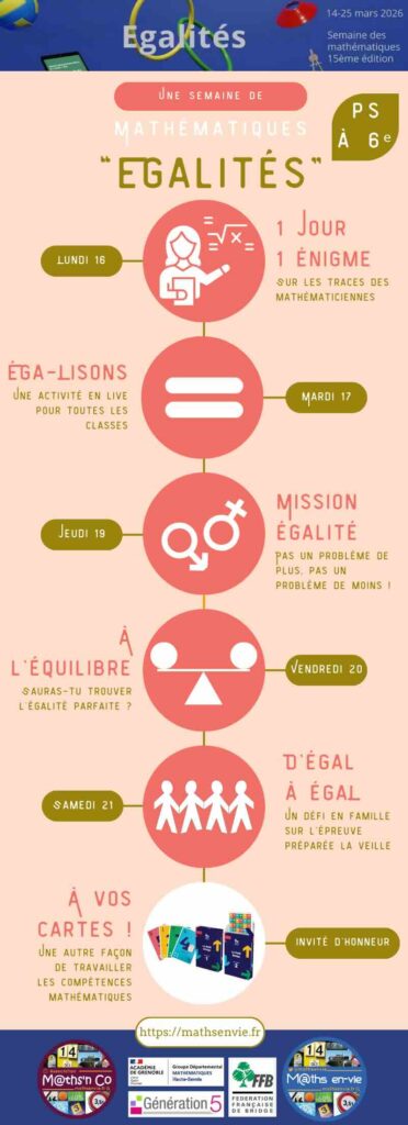 Du 16 au 24 mars 2026, les classes de la petite section à la 6ᵉ sont invitées à vivre une nouvelle édition de la Semaine des mathématiques proposée par M@ths en-vie. Cette année, le thème choisi, « Égalités », met en lumière un enjeu central : l’égalité filles-garçons dans les apprentissages mathématiques.