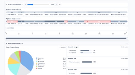 Pour un projet de formation professionnelle, j’ai en effet eu besoin d’une interface d’ingénierie pédagogique visuelle et dynamique, interopérable et capable de s’exécuter localement dans un navigateur. Une telle interface devait permettre de définir et d’organiser par glisser-déposer des séquences pédagogiques et de visualiser les modalités pédagogiques à travers divers graphiques.